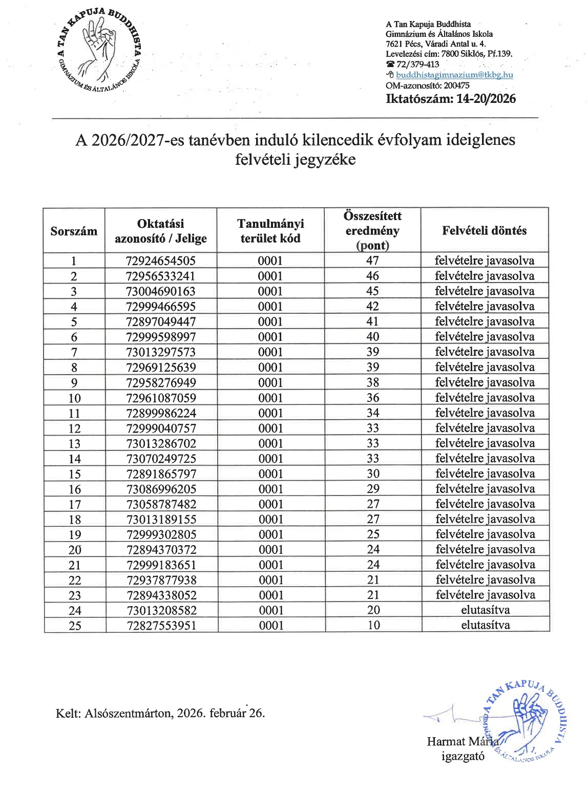 Ideiglenes felvételi jegyzék a 2025/26-os tanévre